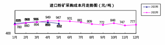 2023年1-5月,煉焦煤采購(gòu)成本同比下降13.83%;冶金焦同比下降22.31%;國(guó)產(chǎn)鐵精礦同比下降6.76%,進(jìn)口粉礦同比下降2.04 %;廢鋼同比下降18.82%。