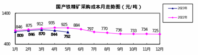 國(guó)產(chǎn)鐵精礦(干基)5月份加權(quán)平均采購(gòu)成本為792.30元/噸,環(huán)比下降51.57元/噸,降幅為6.11%。1-5月累計(jì)平均采購(gòu)成本為833.93元/噸,同比下降60.44元/噸,降幅為6.76%。