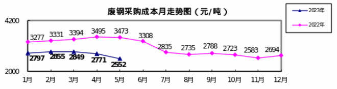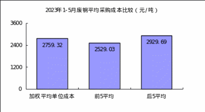 廢鋼5月份加權(quán)平均采購(gòu)成本為2552.01元/噸,環(huán)比下降218.63元/噸,降幅為7.89%。1-5月累計(jì)平均采購(gòu)成本為2759.32元/噸,同比下降639.71元/噸,降幅為18.82%。