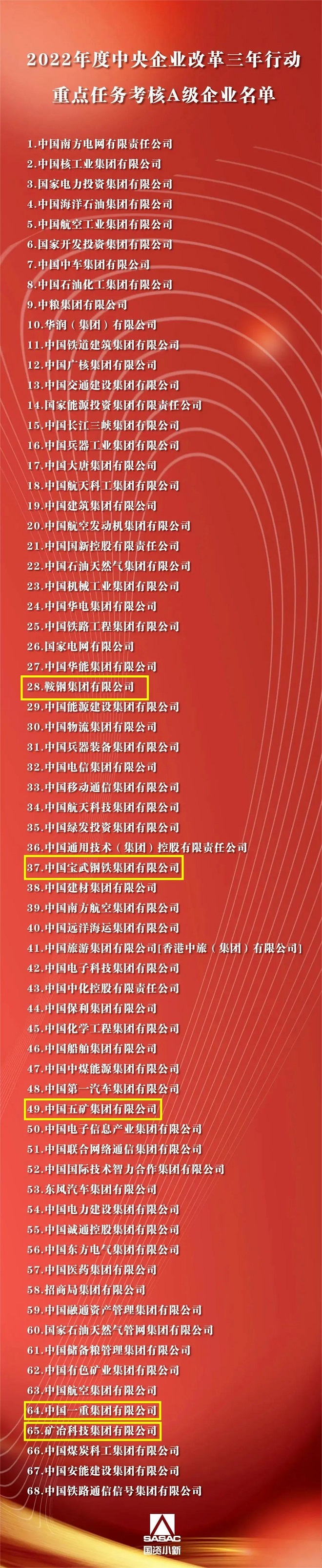根據《中央企業改革三年行動重點任務考核實施方案(試行)》和《中央企業改革三年行動重點任務考核指標表(2022版)》,經審定,2022年度中央企業改革三年行動重點任務考核A級企業名單正式公布,鞍鋼集團、中國寶武、中國五礦、中國一重、礦冶科技集團等鋼鐵及相關企業位列其中。