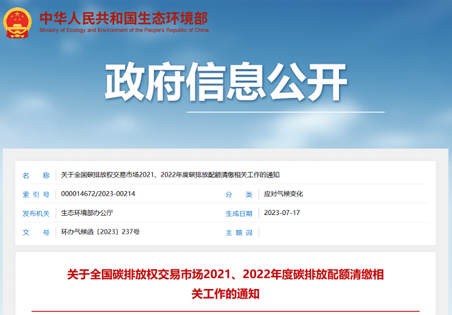 7月17日,生態(tài)環(huán)境部發(fā)布《關(guān)于全國碳排放權(quán)交易市場2021、2022年度碳排放配額清繳相關(guān)工作的通知》(以下簡稱《通知》)。