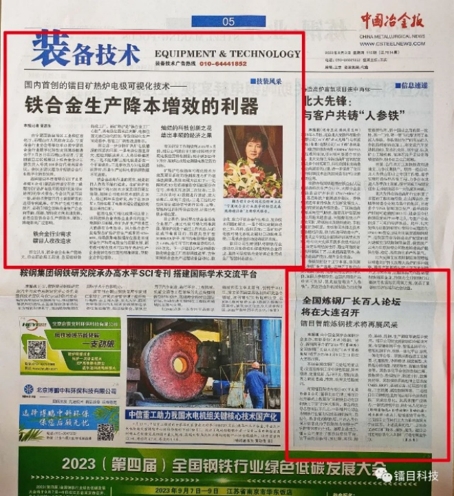 8月3日,《中國冶金報》也在第五版信息速遞欄目重點刊登了此次大會的預告信息,同時《中國冶金報》第五版頭條還重點報道了鐳目礦熱爐電極可視化技術。