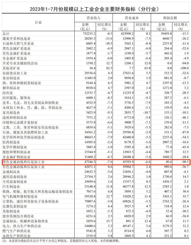 1—7月份,在41個工業大類行業中,13個行業利潤總額同比增長,28個行業下降。主要行業利潤情況如下:電力、熱力生產和供應業利潤總額同比增長51.2%,電氣機械和器材制造業增長33.7%,通用設備制造業增長14.5%,專用設備制造業增長2.1%,汽車制造業增長1.0%,石油和天然氣開采業下降11.4%,紡織業下降20.3%,煤炭開采和洗選業下降26.2%,計算機、通信和其他電子設備制造業下降26.4%,非金屬礦物制品業下降28.8%,農副食品加工業下降32.6%,有色金屬冶煉和壓延加工業下降36.7%,化學原料和化學制品制造業下降54.3%,石油、煤炭及其他燃料加工業下降87.0%,黑色金屬冶煉和壓延加工業下降90.5%。