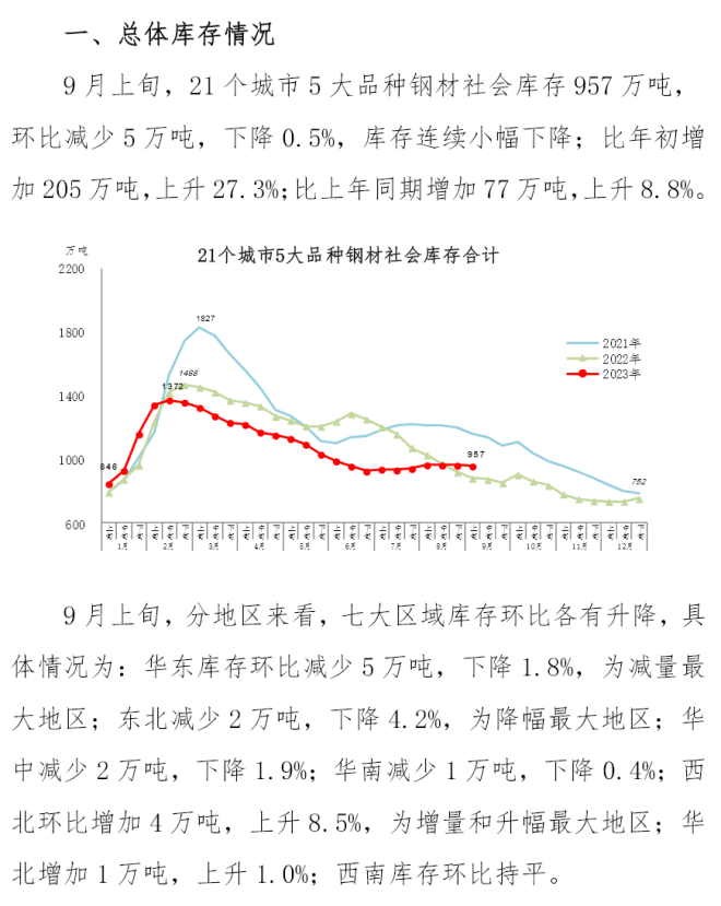 9月上旬鋼材社會庫存957萬噸 環比下降0.5%