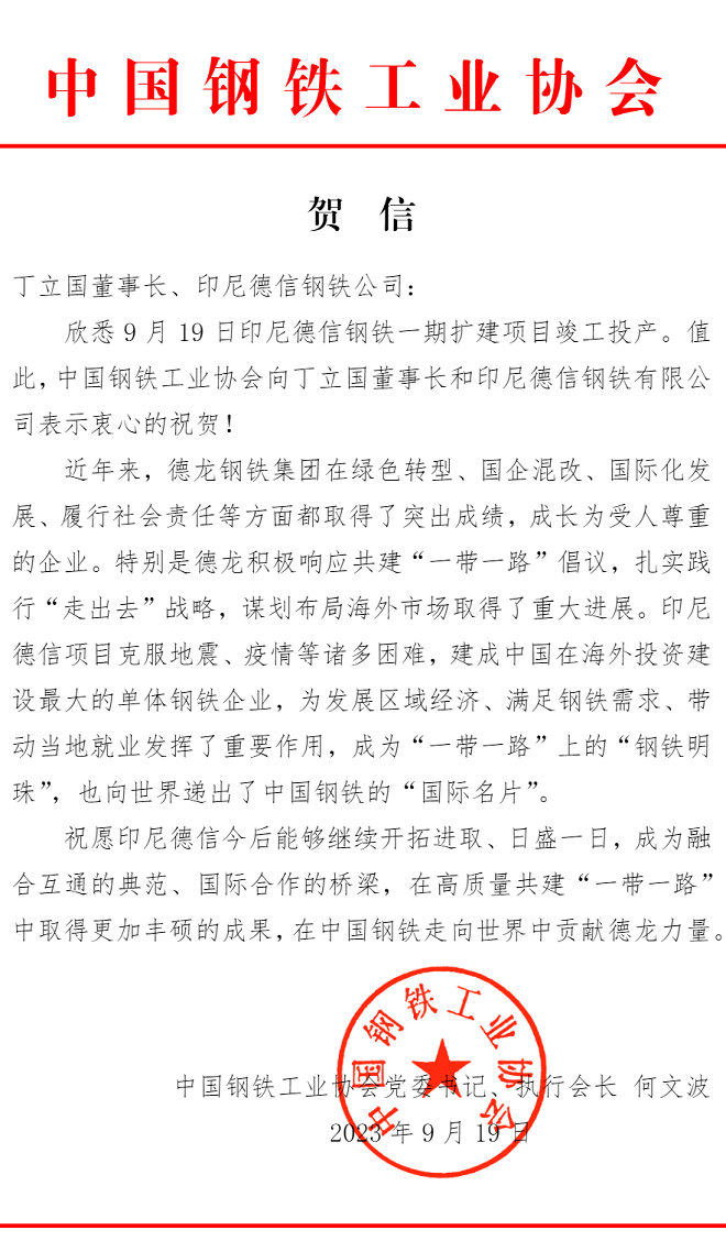 9月19日,印尼德信鋼鐵一期擴建項目竣工投產。中國鋼鐵工業協會第一時間發去賀信表示祝賀,祝愿印尼德信今后能夠繼續開拓進取、日盛一日,成為融合互通的典范、國際合作的橋梁,在高質量共建“一帶一路”中取得更加豐碩的成果,在中國鋼鐵走向世界中貢獻德龍力量。