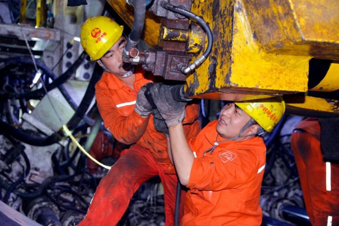 中鐵隧道局一處“忠誠擔當”青年突擊隊成員在隧道施工現場檢查大型機械化配套設備。