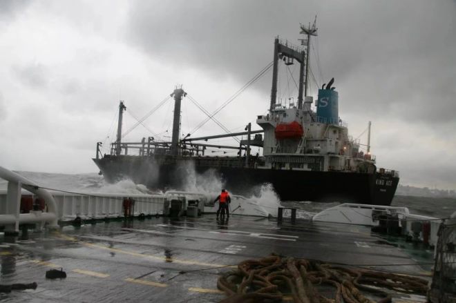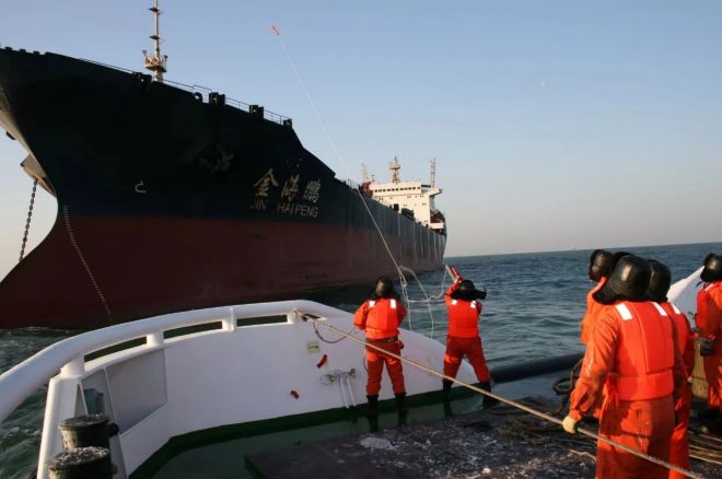 “北海救111”輪在秦皇島錨地,救助尾軸故障失去動力的貨船“金海鵬”輪,34名遇險船員隨船獲救。