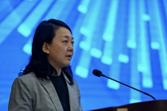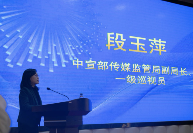 圖為中宣部傳媒監管局副局長、一級巡視員段玉萍出席并致辭。