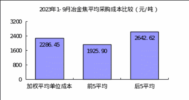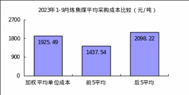 1—9月對標企業冶金焦平均采購成本最低的前5家企業的加權平均采購成本為1925.90元/噸,比對標企業平均采購成本低360.56元/噸,低于平均采購成本15.77%;而采購成本最高的5家企業的加權平均采購成本為2642.62元/噸,比對標企業平均采購成本高356.17元/噸,高于平均采購成本15.58%。