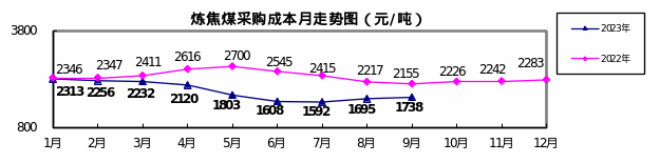 對標企業煉焦煤9月份加權平均折算成干基的采購成本為1738.31元/噸,環比升高43.20元/噸,升幅為2.55%。1—9月累計平均折算成干基的采購成本為1925.49元/噸,同比下降488.61元/噸,降幅為20.24%。