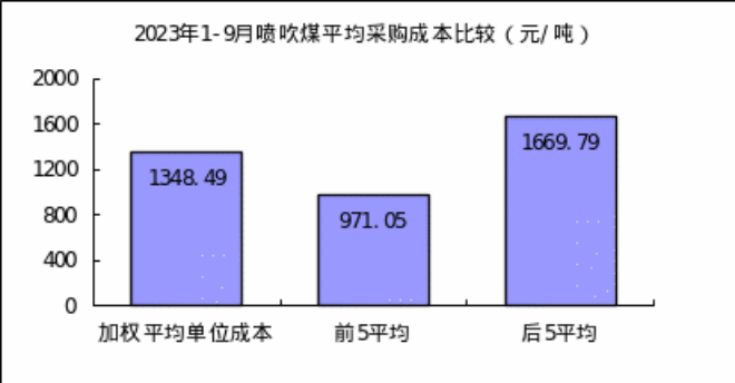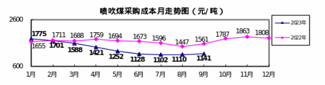 噴吹煤9月份加權平均折算成干基的采購成本為1141.31元/噸,環比升高31.56元/噸,升幅為2.84%。1—9月累計平均折算成干基的采購成本為1348.49元/噸,同比下降279.62元/噸,降幅為17.17%。