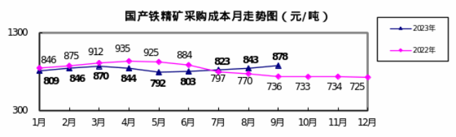 國產鐵精礦(干基)9月份加權平均采購成本為877.53元/噸,環比升高34.56元/噸,升幅為4.10%。1—9月累計平均采購成本為838.55元/噸,同比下降18.71元/噸,降幅為2.18%。