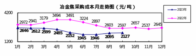 冶金焦9月份加權平均折算成干基的采購成本2127.03元/噸,環比升高32.28元/噸,升幅為1.54%。1—9月累計平均折算成干基的采購成本為2286.45元/噸,同比下降751.81元/噸,降幅為24.74%。