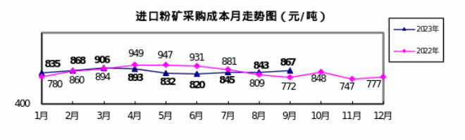 進口粉礦9月份加權平均采購成本867.20元/噸,環比升高23.93元/噸,升幅為2.84%。1—9月累計平均采購成本為856.38元/噸,同比下降11.16元/噸,降幅為1.29%。