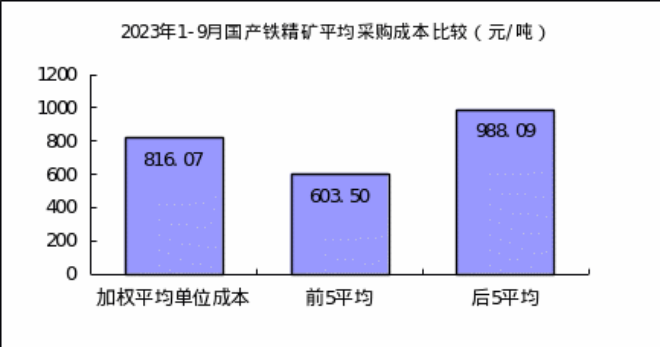 1—9月對標企業國產鐵精礦折算成62%品位的平均采購成本為816.07元/噸,成本最低的前5家企業的加權平均采購成本為603.50元/噸,比對標企業平均采購成本低212.57元/噸,低于平均采購成本26.05%;而采購成本最高的5家企業的加權平均采購成本為988.09元/噸,比對標企業平均采購成本高172.01元/噸,高于平均采購成本21.08%。