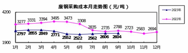 廢鋼9月份加權平均采購成本為2604.43元/噸,環比下降1.77元/噸,降幅為0.07%。1—9月累計平均采購成本為2677.32元/噸,同比下降548.94元/噸,降幅為17.01%。