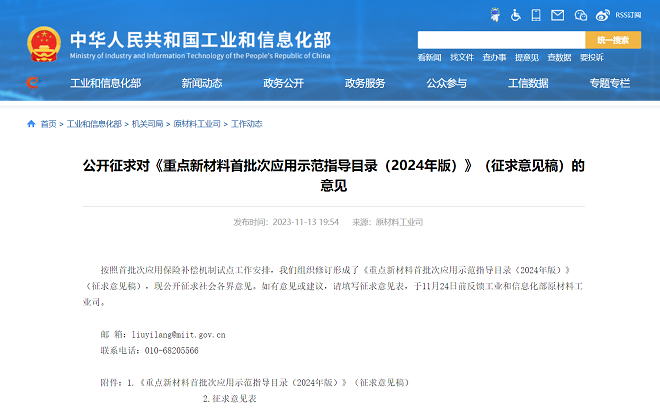 按照首批次應(yīng)用保險(xiǎn)補(bǔ)償機(jī)制試點(diǎn)工作安排,國家工信部原材料工業(yè)司已組織修訂形成了《重點(diǎn)新材料首批次應(yīng)用示范指導(dǎo)目錄(2024年版)》(征求意見稿),并從2023年11月14日至11月23日公開征求社會(huì)各界意見。如有意見或建議,可于11月24日前反饋給工信部原材料工業(yè)司(郵箱:liuyilang@miit.gov.cn,聯(lián)系電話:010-68205566)。