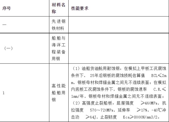 該意見稿中,居首的是“先進(jìn)基礎(chǔ)材料”中的“先進(jìn)鋼鐵材料”部分。該部分又分為六大塊:船舶與海洋工程裝備用鋼、交通裝備用鋼、能源裝備用鋼、航空航天用鋼、電子信息用鋼、其他,具體如下: