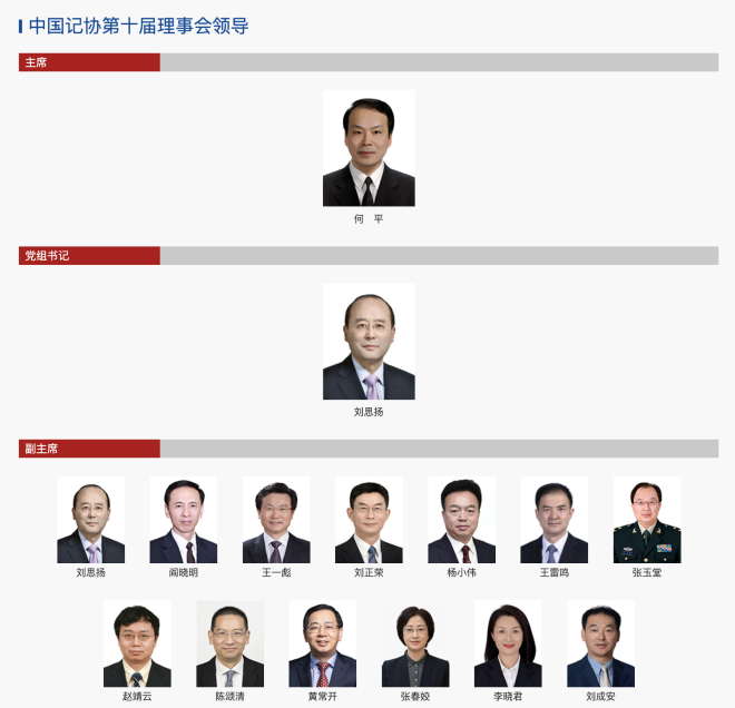 中國(guó)記協(xié)第十屆理事會(huì)領(lǐng)導(dǎo)如下: