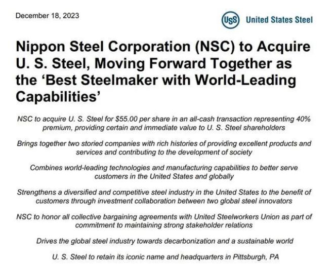 北京時間12月18日晚間,日本制鐵和美國鋼鐵公司共同宣布,日本制鐵將以55美元/股的價格對美國鋼鐵公司進行純現金收購。該交易已獲得日本制鐵和美國鋼鐵董事會的一致批準。