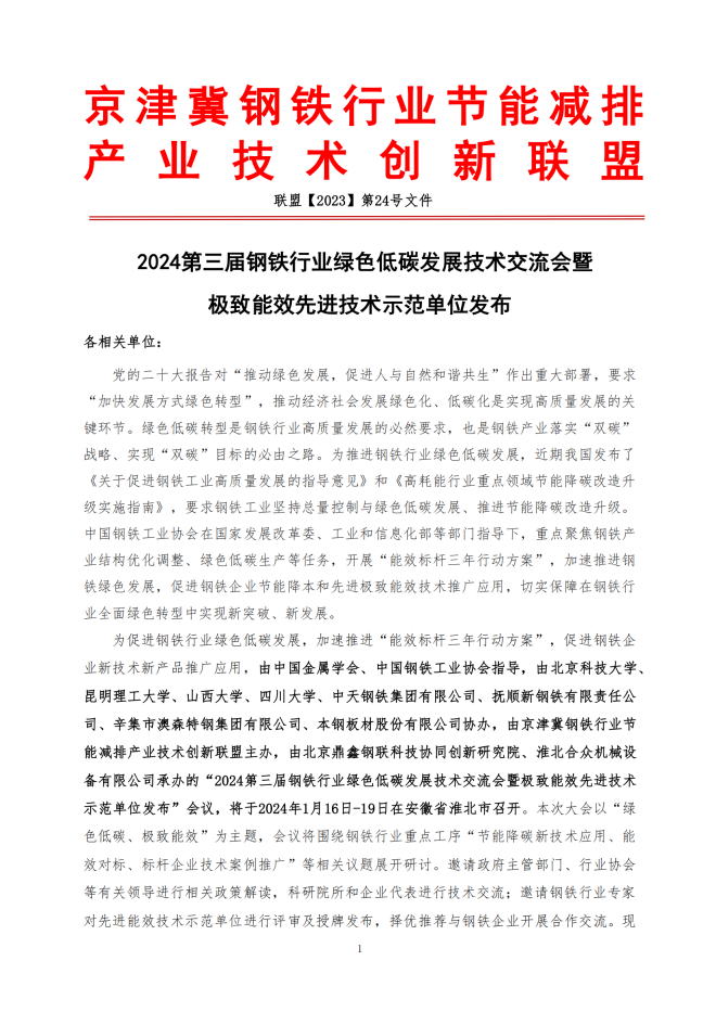 2024第三屆鋼鐵行業(yè)綠色低碳發(fā)展技術(shù)交流會(huì)暨極致能效先進(jìn)技術(shù)示范單位發(fā)布