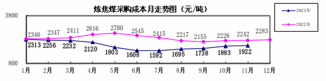 2023年1—11月,煉焦煤采購成本同比下降19.35%;冶金焦同比下降22.59%;國產(chǎn)鐵精礦同比下降2.06%,進(jìn)口粉礦同比上升1.91%;廢鋼同比下降15.07%。