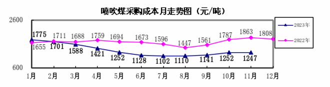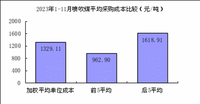 噴吹煤11月份加權(quán)平均折算成干基的采購成本為1247.22元/噸,環(huán)比下降4.86元/噸,降幅為0.39%。1—11月累計(jì)平均折算成干基的采購成本為1329.11元/噸,同比下降337.87元/噸,降幅為20.27%。