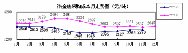 冶金焦11月份加權(quán)平均折算成干基的采購成本2270.28元/噸,環(huán)比升高5.63元/噸,升幅為0.25%。1—11月累計(jì)平均折算成干基的采購成本為2283.33元/噸,同比下降666.30元/噸,降幅為22.59%。