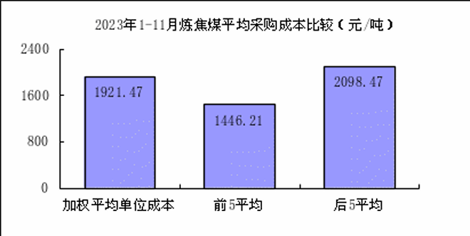 1—11月對標(biāo)企業(yè)冶金焦平均采購成本最低的前5家企業(yè)的加權(quán)平均采購成本為1933.80元/噸,比對標(biāo)企業(yè)平均采購成本低349.53元/噸,低于平均采購成本15.31%;而采購成本最高的5家企業(yè)的加權(quán)平均采購成本為2634.18元/噸,比對標(biāo)企業(yè)平均采購成本高350.85元/噸,高于平均采購成本15.37%。