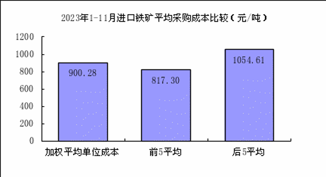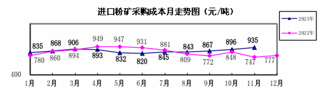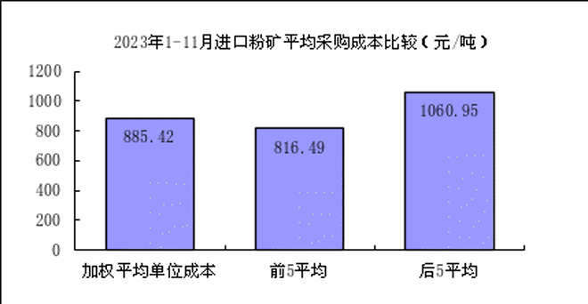 進(jìn)口粉礦11月份加權(quán)平均采購成本934.58元/噸,環(huán)比升高38.20元/噸,升幅為4.26%。1—11月累計(jì)平均采購成本為867.29元/噸,同比升高16.27元/噸,升幅為1.91%。