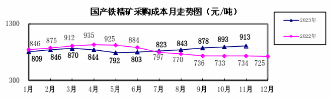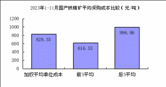 國產(chǎn)鐵精礦(干基)11月份加權(quán)平均采購成本為912.75元/噸,環(huán)比升高19.35元/噸,升幅為2.17%。1—11月累計(jì)平均采購成本為850.66元/噸,同比下降17.92元/噸,降幅為2.06%。