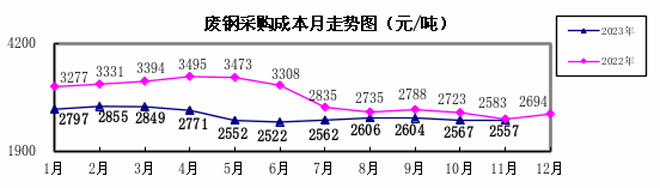 廢鋼11月份加權(quán)平均采購成本為2556.58元/噸,環(huán)比下降10.27元/噸,降幅為0.40%。1—11月累計(jì)平均采購成本為2656.05元/噸,同比下降471.25元/噸,降幅為15.07%。