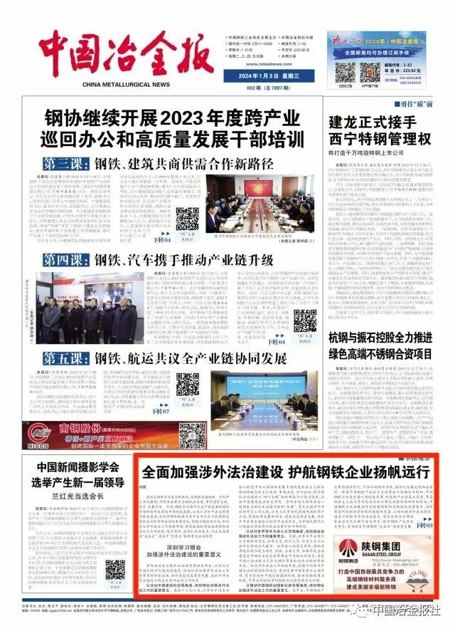 法治是國際交往最大的共識,是國際共通話語。習近平總書記強調,涉外法治事關全面依法治國,事關國家主權、安全、發展利益。當前,鋼鐵企業面對日益嚴峻復雜的國際形勢和前所未有的外部風險挑戰,必須以習近平法治思想為根本遵循,深刻理解和把握習近平總書記關于統籌推進國內法治和涉外法治的重要論述,堅持正確政治方向,加快企業涉外法治工作戰略布局,持續提高運用法治思維和法治方式應對挑戰、防范風險、反制打壓的能力,為企業高質量“走出去”、高水平“引進來”提供有力法治保障。