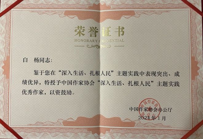 由中國冶金作協推薦的安鋼作家白楊在“深入生活、扎根人民”主題實踐中表現突出、成績優異,被授予中國作家協會“深入生活、扎根人民”主題實踐優秀作家榮譽稱號。