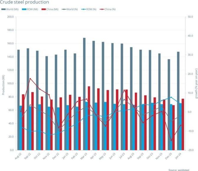 2024年1月全球71個納入世界鋼鐵協會統計國家的粗鋼產量為1.481億噸,同比下降1.6%。