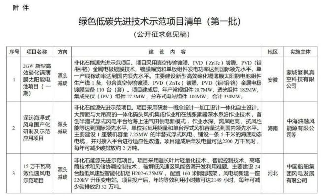 為貫徹落實黨中央、國務院決策部署,加快綠色低碳先進技術示范應用和推廣,按照國家發展改革委等10部門聯合印發的《綠色低碳先進技術示范工程實施方案》(發改環資〔2023〕1093號)有關部署,經過項目單位申報、地方審核推薦、第三方機構評審、部門及地方復核等流程,確定了第一批綠色低碳先進技術示范項目清單,共納入47個項目,現向社會公開征求意見。