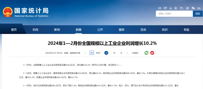 2024年1—2月份全國規(guī)模以上工業(yè)企業(yè)利潤增長10.2%