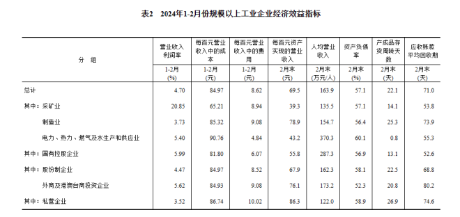 1—2月份,規(guī)模以上工業(yè)企業(yè)實(shí)現(xiàn)營業(yè)收入19.44萬億元,同比增長4.5%;發(fā)生營業(yè)成本16.52萬億元,增長4.6%;營業(yè)收入利潤率為4.70%,同比提高0.24個(gè)百分點(diǎn)。