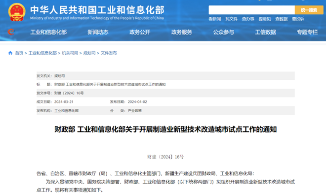 財政部 工業和信息化部關于開展制造業新型技術改造城市試點工作的通知