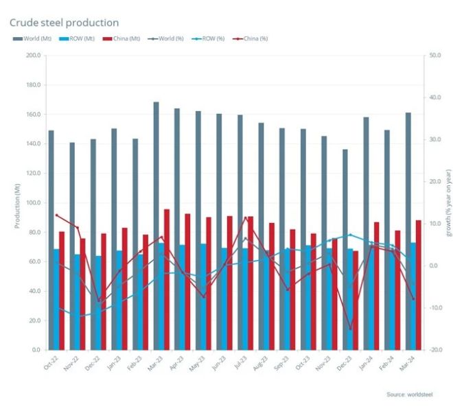 2024年3月全球粗鋼產(chǎn)量