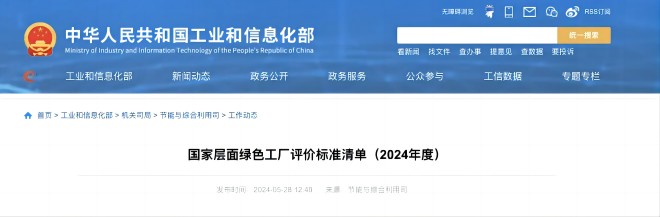 5月28日,工信部公布《國家層面綠色工廠評價標準清單(2024年度)》。