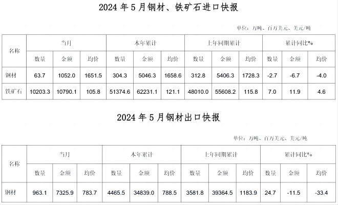 根據(jù)海關統(tǒng)計快訊數(shù)據(jù),2024年5月,我國進口鋼材63.7萬噸,環(huán)比減少2.1萬噸,下降3.2%;均價1651.5美元/噸,環(huán)比減少55.9美元/噸,下降3.3%。1-5月累計進口鋼材304.3萬噸,同比減少8.5萬噸,下降2.7%。
