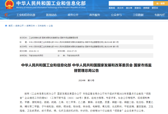 按照《工業和信息化部辦公廳 國家發展改革委辦公廳 市場監管總局辦公廳關于組織開展2023年度重點行業能效“領跑者”企業遴選工作的通知》(工信廳聯節函〔2023〕348號)要求,經地方推薦、專家評審、社會公示等程序,現將煤制焦炭,甲醇,煤制烯烴,燒堿,純堿,乙烯,對二甲苯,乙二醇,黃磷,合成氨,尿素,磷酸一銨,磷酸二銨,鈦白粉,聚氯乙烯,精對苯二甲酸,子午線輪胎,鋼鐵,銅冶煉,鉛冶煉,鋅冶煉,電解鋁,氧化鋁,水泥熟料,平板玻璃,建筑陶瓷,衛生陶瓷,衛生紙原紙、紙巾原紙,棉、化纖及混紡機織物,針織物、紗線等30個行業能效“領跑者”企業名單予以公告。