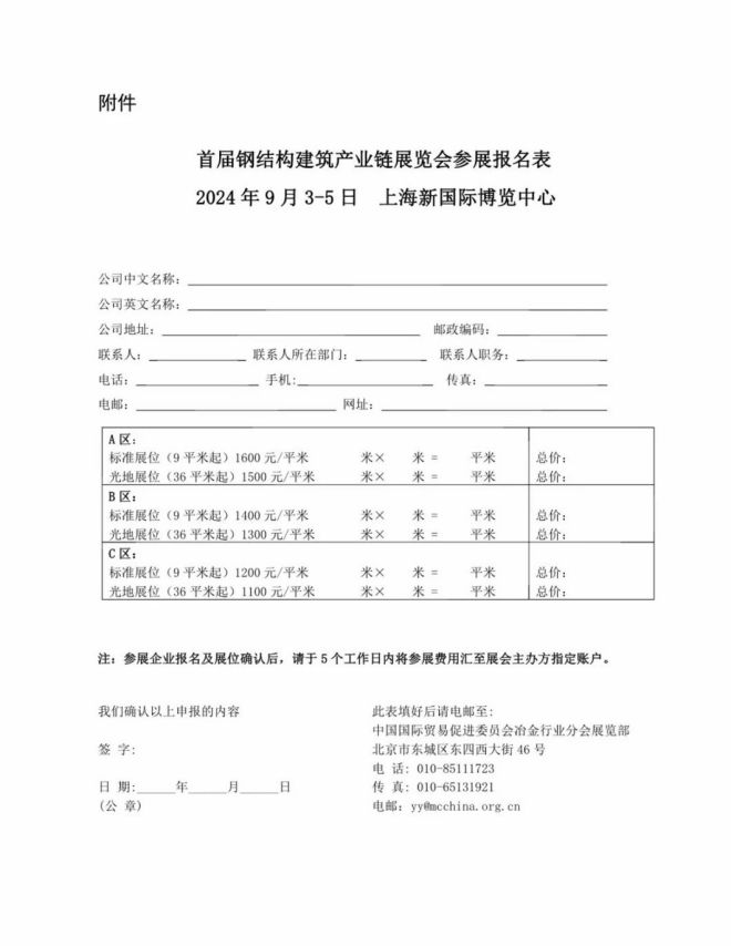 由中國鋼鐵工業(yè)協(xié)會、中國房地產業(yè)協(xié)會、中國鋼結構協(xié)會、中國建筑金屬結構協(xié)會、中國建筑節(jié)能協(xié)會、中國國際貿易促進委員會冶金行業(yè)分會主辦,中國建筑業(yè)協(xié)會、中國勘察設計協(xié)會支持,冶金工業(yè)國際交流合作中心承辦的“首屆鋼結構建筑產業(yè)鏈展覽會”(以下簡稱“鋼結構展”)將于2024年9月3日一5日在上海新國際博覽中心舉行。主辦方誠邀國內外鋼鐵、鋼結構、建筑產業(yè)鏈和生態(tài)圈相關企業(yè)積極參加本屆展覽會。