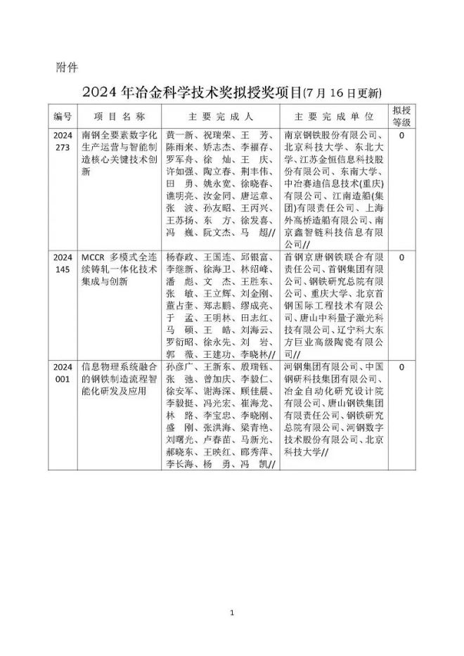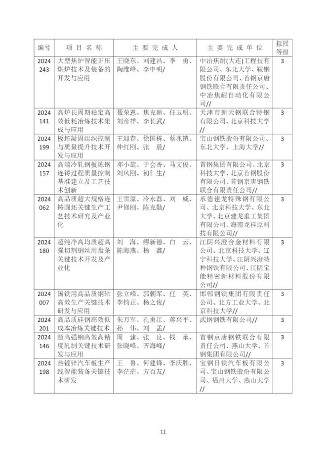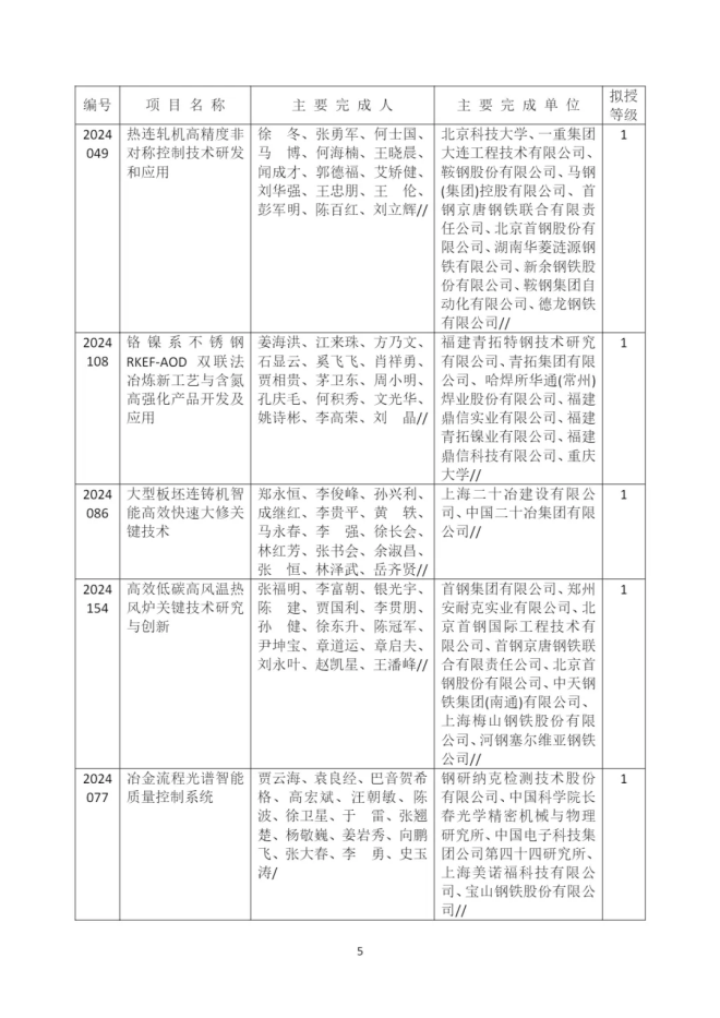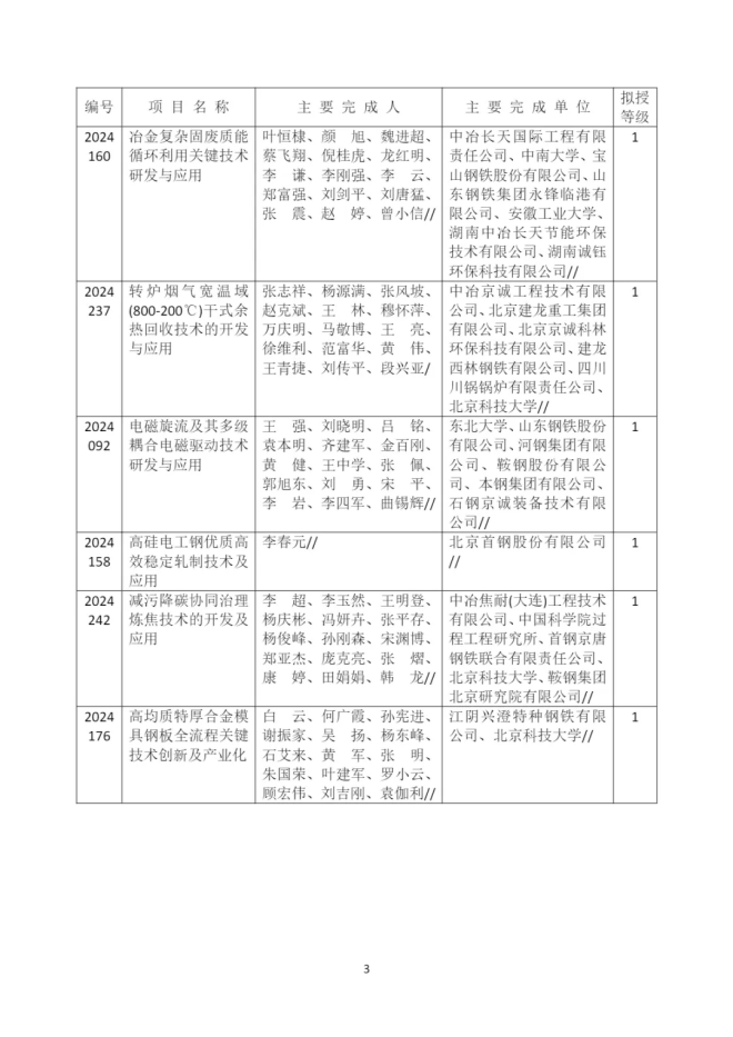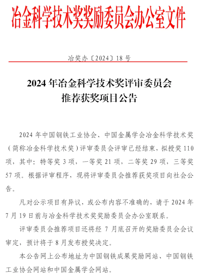 2024年中國鋼鐵工業協會、中國金屬學會冶金科學技術獎(簡稱冶金科學技術獎)評審委員會評審已經結束,擬授獎110項,其中:特等獎3項,一等獎21項,二等獎29項,三等獎57項。根據評審程序,現將評審委員會推薦獲獎項目向社會公告。