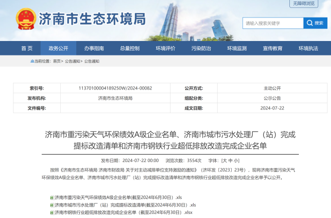 7月22日,濟南市生態環境局官網發布,濟南市重污染天氣環??冃級企業名單、濟南市城市污水處理廠(站)完成提標改造清單和濟南市鋼鐵行業超低排放改造完成企業名單。