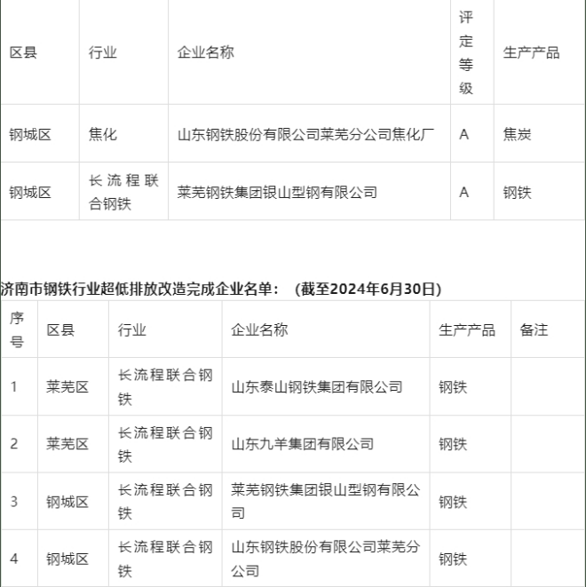 濟南市重污染天氣環??冃級鋼鐵企業名單:(截至2024年6月30日)