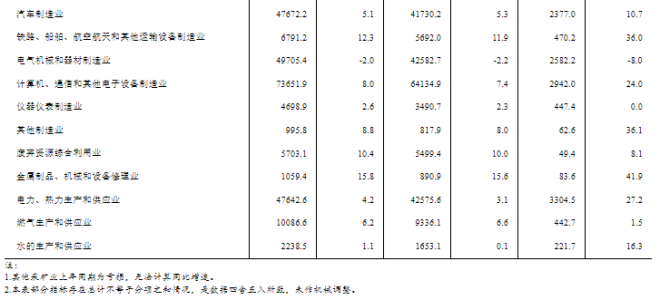 1—6月份,全國規模以上工業企業實現利潤總額35110.3億元,同比增長3.5%。1—6月份,主要行業利潤情況如下:有色金屬冶煉和壓延加工業利潤同比增長78.2%,電力、熱力生產和供應業增長27.2%,計算機、通信和其他電子設備制造業增長24.0%,紡織業增長19.3%,農副食品加工業增長19.2%,汽車制造業增長10.7%,石油和天然氣開采業增長7.5%,通用設備制造業增長3.6%,化學原料和化學制品制造業增長2.3%,專用設備制造業下降4.2%,電氣機械和器材制造業下降8.0%,煤炭開采和洗選業下降24.8%,非金屬礦物制品業下降49.9%,石油煤炭及其他燃料加工業、黑色金屬冶煉和壓延加工業同比由盈轉虧。