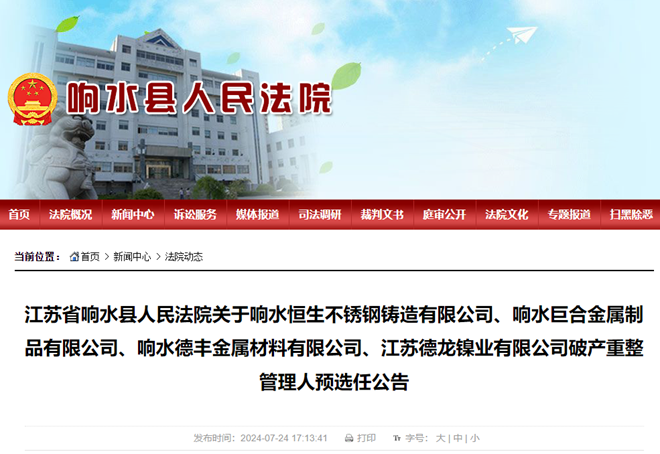 7月24日,江蘇省響水縣人民法院發(fā)布公告稱,已立案審查德龍鎳業(yè)、響水恒生不銹鋼鑄造有限公司、響水巨合金屬制品有限公司、響水德豐金屬材料有限公司四家公司破產(chǎn)重整案。法院尚未決定是否最終受理上述案件。