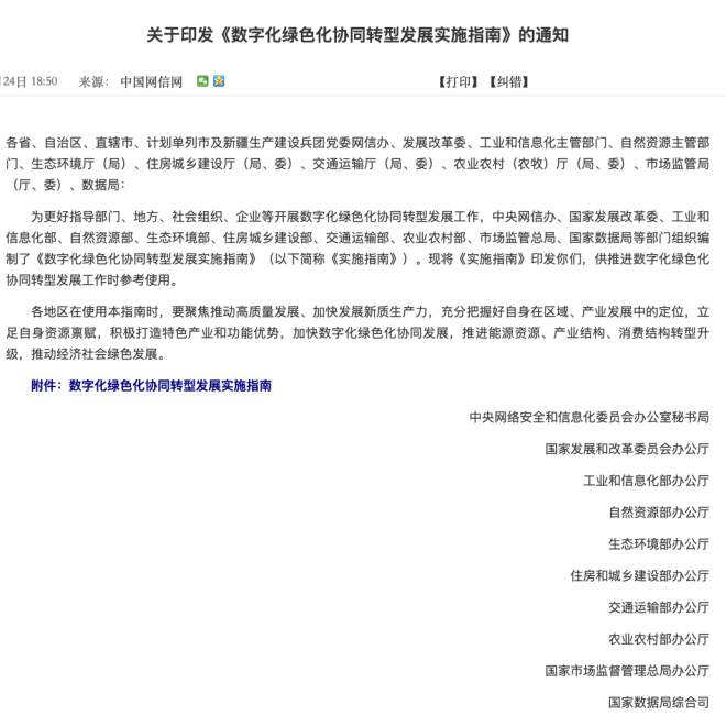 近日,中央網(wǎng)信辦等十部門秘書局(辦公廳、綜合司)聯(lián)合印發(fā)《數(shù)字化綠色化協(xié)同轉(zhuǎn)型發(fā)展實(shí)施指南》(以下簡稱《實(shí)施指南》),實(shí)施指南明確了推動數(shù)字產(chǎn)業(yè)綠色低碳發(fā)展、加快數(shù)字技術(shù)賦能行業(yè)綠色化轉(zhuǎn)型等雙化協(xié)同兩大發(fā)力方向。